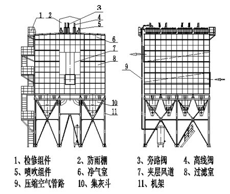 3、袋式除尘这一术语包含了收尘(尘粒从气流里分离)以及定阻(或定时)清灰(把己收集的尘粒从滤布上清除下来)两个过程。