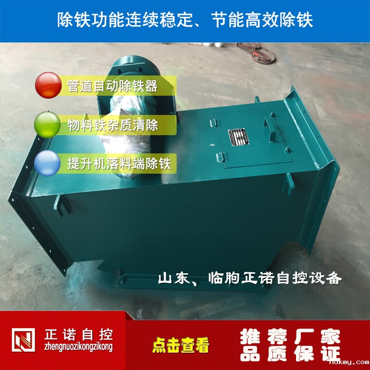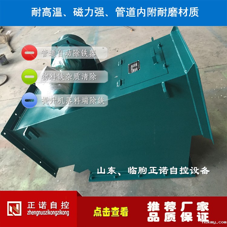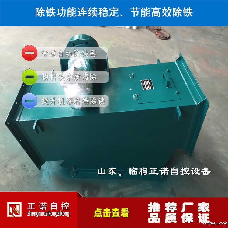 变形壳转动为磁系运转,从结构上加大了磁系的作用过程,配以独特的分离机构,铁杂物分享更彻底。采用耐高温、强磁力的钕铁硼磁材,磁场强度高。整机串接于粉料输送管道中,法兰式联接,安装方便。除铁、卸铁自动完成,设备运转无需专人看管。永磁体做磁源,无需耗电,小功率电力排渣,耗电极低,结构紧凑,工作稳定可靠。